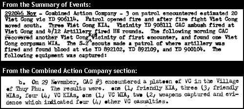 A Note from The Virtual WallThe Marines have a long history of counter-insurgency operations dating from the Spanish-American War, and one of the first things they did on arrival in Vietnam was to establish the "Combined Action Program". Under this concept, a squad-sized element of Marines, usually including a Navy Corpsman, was mated with a Vietnamese Regional or Popular Forces unit. The Combined Action unit provided the RF/PF unit with training, additional firepower, and the ability to call in supporting air and artillery fire. The Combined Action teams lived in the villages, sharing both daily life and daily risks with the Vietnamese. Initially each Marine battalion formed Combined Action teams within its own area of responsibility, but by mid-1968 the CAP had grown to a separate regimental-size command directly subordinate to the Commanding General, III MAF.The 3rd Bn, 4th Marines Command Chronology for November 1965 contains two entries regarding the 3/4 CAP engagement on 29 November: